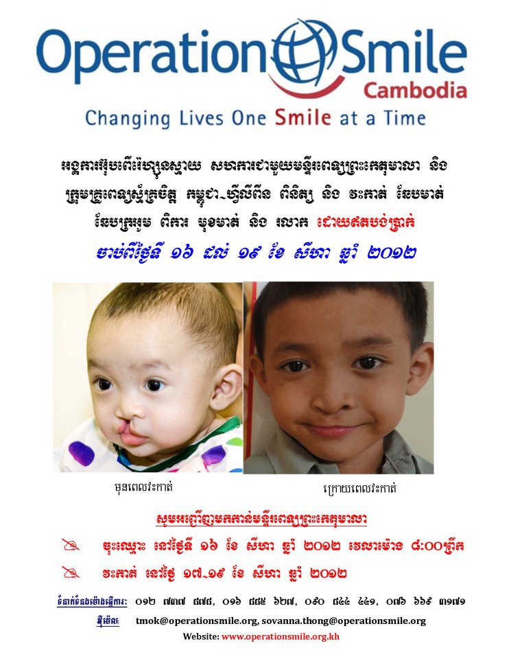មន្ទីពេទ្យព្រះកេតុមាលាកម្ពុជា និងOperation Smile Cambodia ផ្តល់ជូនការវះកាត់បបូរមាត់ឆែប ពិការ មុខមាត់ និងរលាក ដោយឥតគិតថ្លៃ